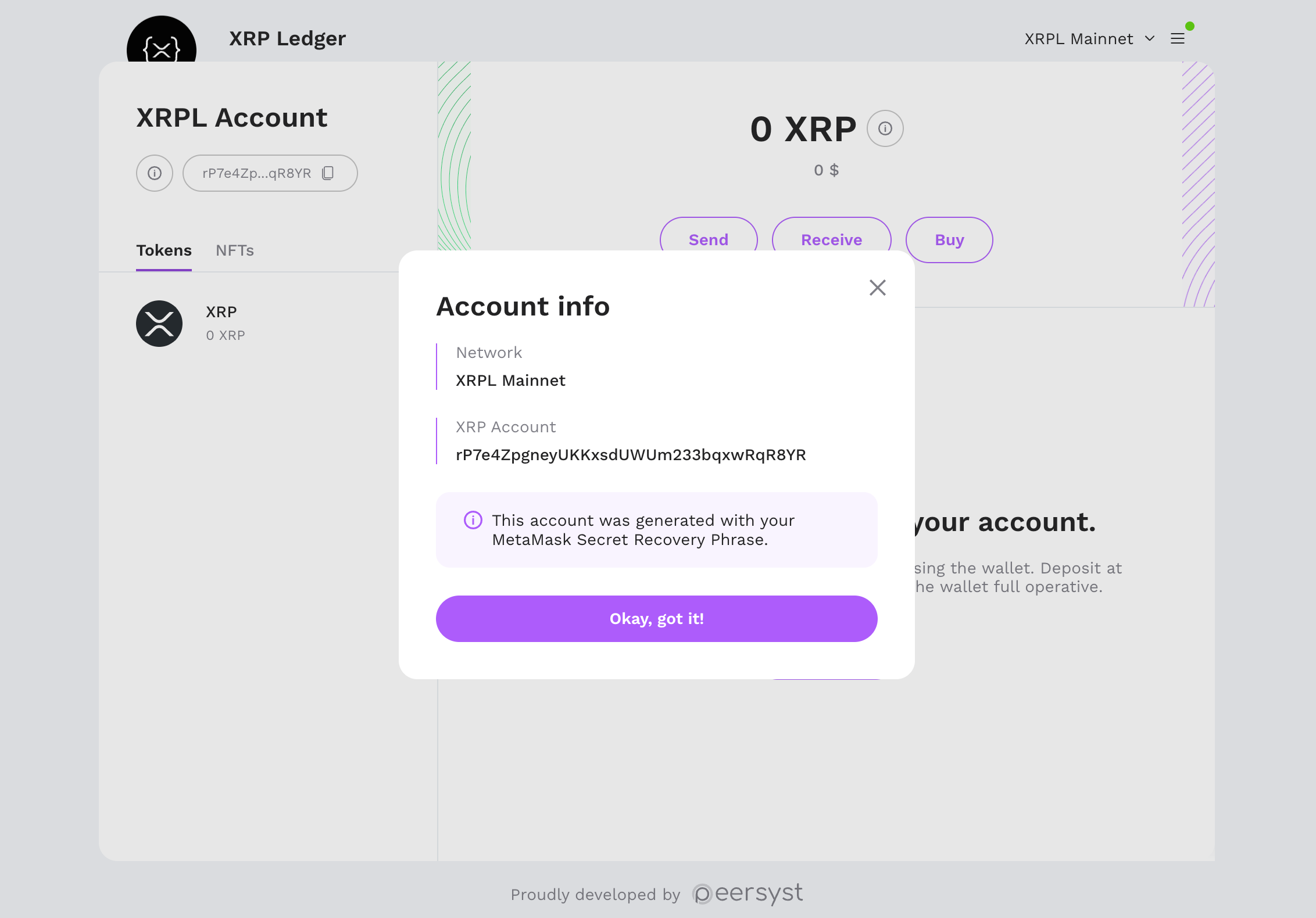 **Important:** Never share your mnemonic phrase or private keys with anyone. Neither the Peersyst team nor the MetaMask team will ever ask for your secrets. Always keep your keys secure and private.&#x20;